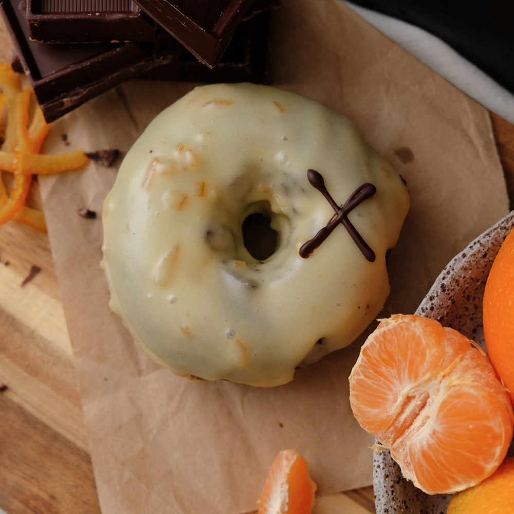 Our dark chocolate cake dough, filled with a chocolate and orange ganache and topped with homemade mandarin and orange icing.