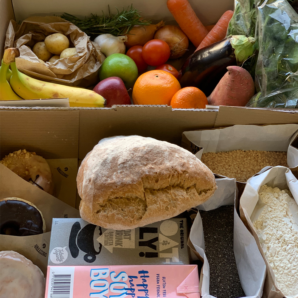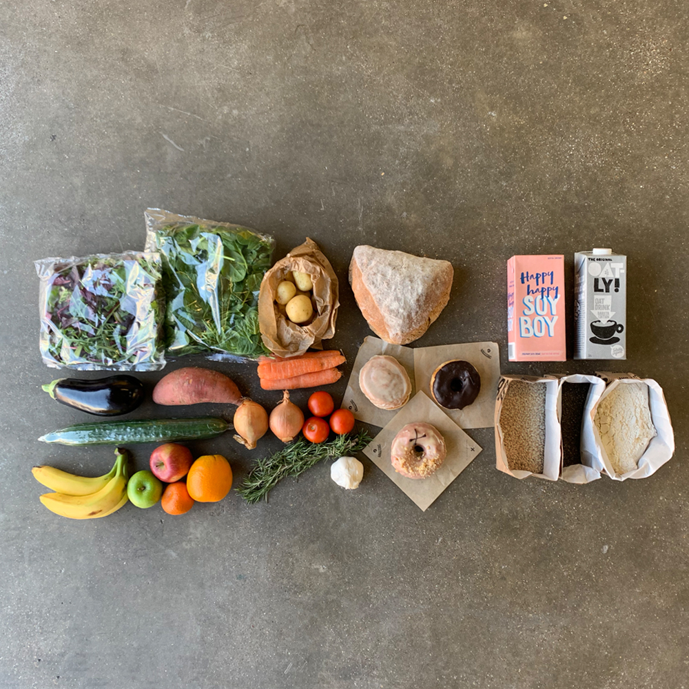 The Mini Vegan Collective Box is perfect for individuals or couples – it comes filled with items from The Estate Dairy (high-grade milk alternatives), Millers Bakery and our local fruit & veg supplier.